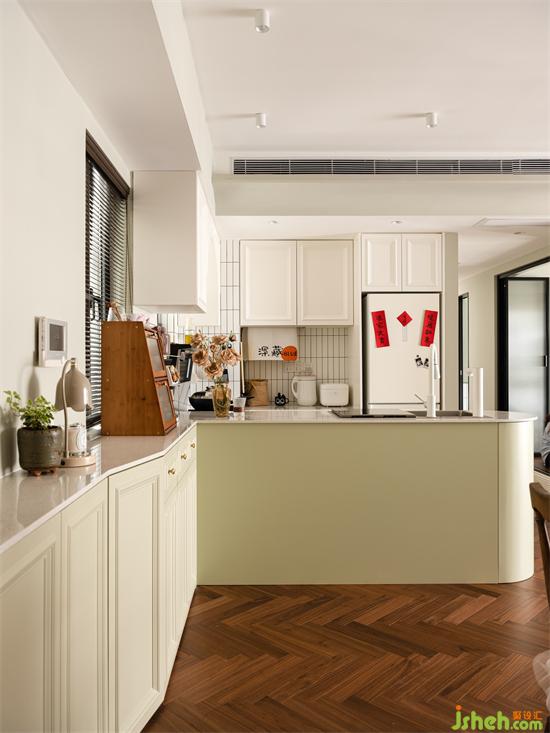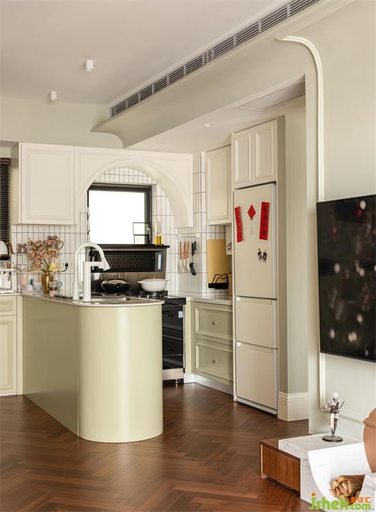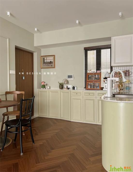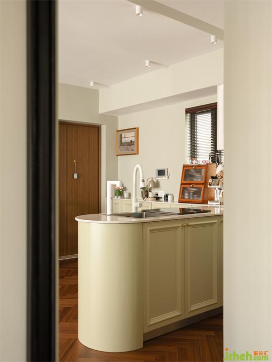 由功能的實現(xiàn)定義空間形式,代替墻體的分隔,以廚房的操作島臺連接過渡玄關(guān)-廚房-過道-客餐廳,開放格局放大縱深比例增強視覺的通透感,入戶玄關(guān)的儀式也藉由清新的煙火氣息實現(xiàn)小家的浪漫歸屬氛圍。
