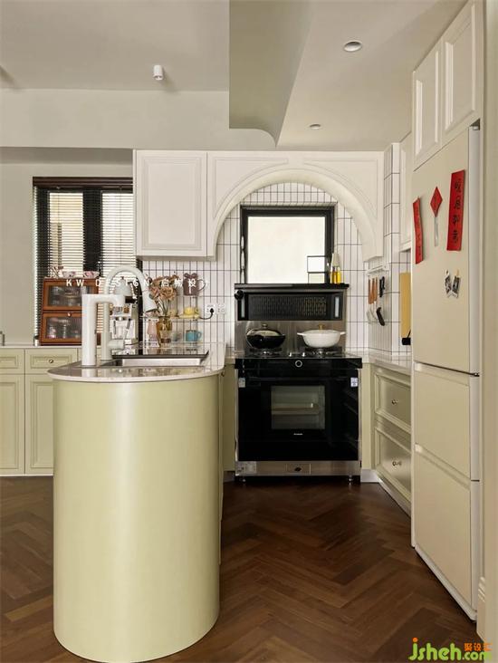開放式廚房兩面墻體一面對著門,一面是窗,考慮風(fēng)水、操作習(xí)慣和空間利用率,棲游家園家裝設(shè)計在靠窗這面選用集成灶做烹飪區(qū),上部空間做吊柜增加儲物,拱形造型弱化窗洞。黑色集成灶和整體復(fù)古空間是搭的,窗簾窗框和部分家具也有黑色元素。