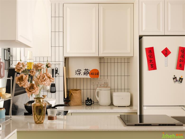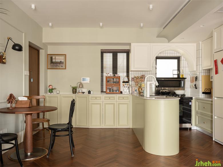 綠+白的配色有寧靜舒適、歲月靜好的即視感,墻面豎鋪窄長條形小白磚清新別致。
