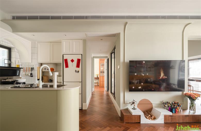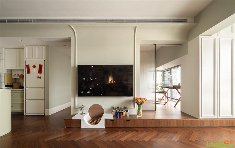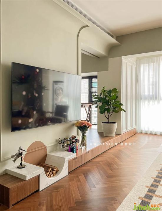 為了讓電視墻更具藝術(shù)感和個性化,在和兩位屋主溝通概念的時候溝通用壁爐的形式表現(xiàn),棲游家園家裝設(shè)計考慮柴火形式的壁爐不安全,最后考慮用大理石在抽屜上搭一個簡易爐的結(jié)構(gòu),放一些干柴,再刷一個接近火焰的墻漆顏色,這樣的搭配保留了壁爐的生態(tài)和原始的的溫暖意向,有了設(shè)計亮點也讓休閑區(qū)域充滿儀式浪漫。
