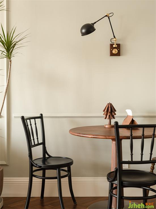 多立克圓桌與黑色索耐特14號椅,融合現(xiàn)代與古典的藝術(shù)搭配延續(xù)時尚與懷舊格調(diào),圍合得布置使空間間隔緊湊而有余,滿足日常一家三口或輕食或休閑的多樣化就餐場景。