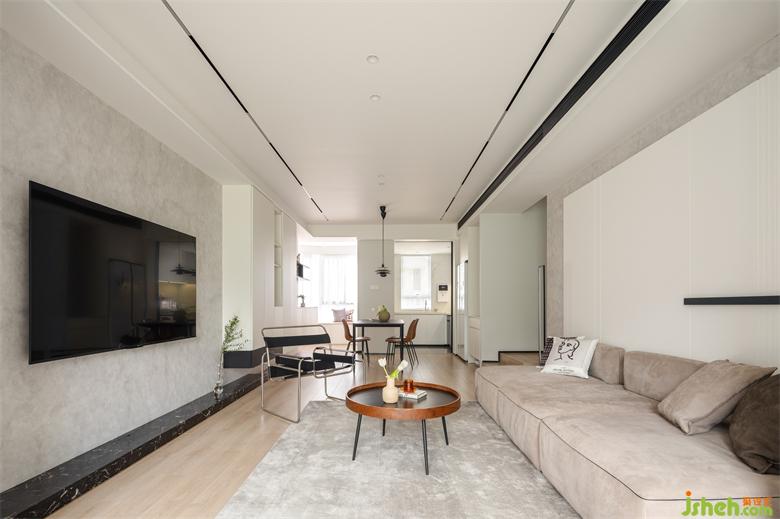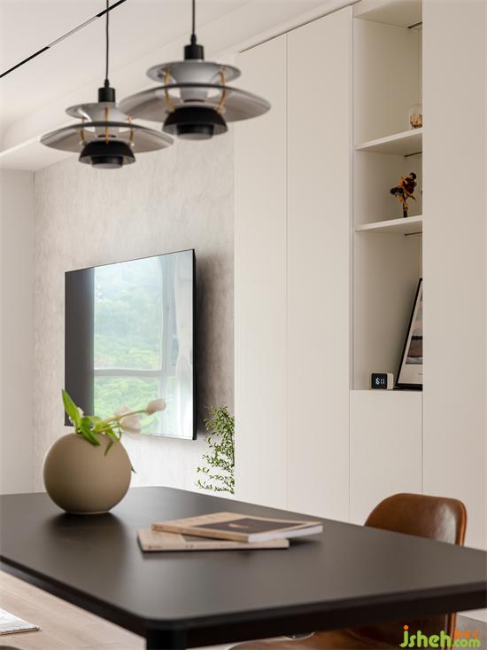 山居歲月家裝設(shè)計(jì)考慮開(kāi)間尺度,保留舒適的視聽(tīng)距離和感受,電視背景沒(méi)有延續(xù)滿墻收納,涂刷水泥藝術(shù)涂料增加背景層次感。10公分高的黑色大理石地臺(tái)隱藏插座電線,形成3米多的低矮平臺(tái)向下收納,放影音設(shè)備或其他展示物品。
