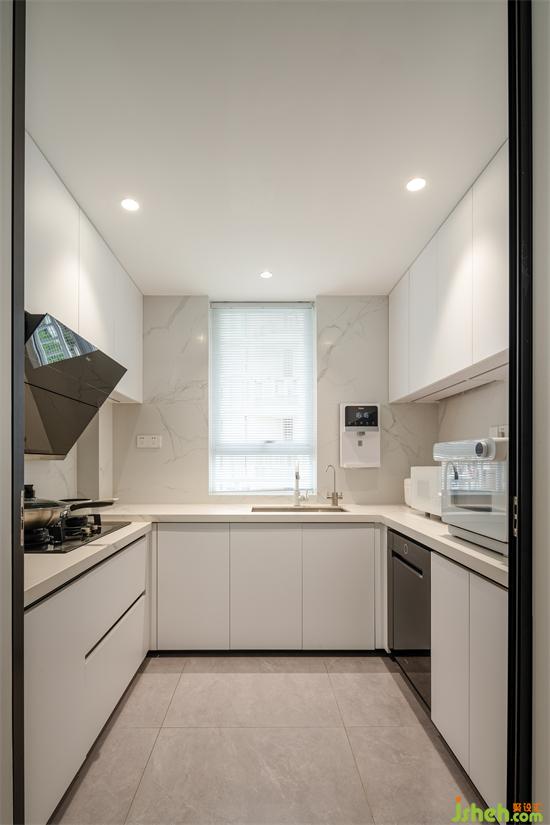 高效合理的U型廚房布局配備完善的五金功能,山居歲月家裝設(shè)計(jì)以及符合操作習(xí)慣的高低臺(tái)面讓使用者更輕松舒適。