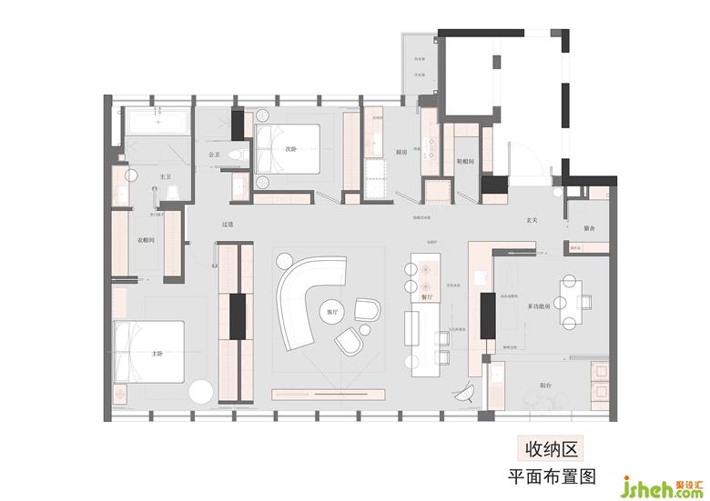 3. 各區(qū)配置好拿好放的隱藏式收納柜,圍合式家居布局釋放便捷靈活的生活動線。