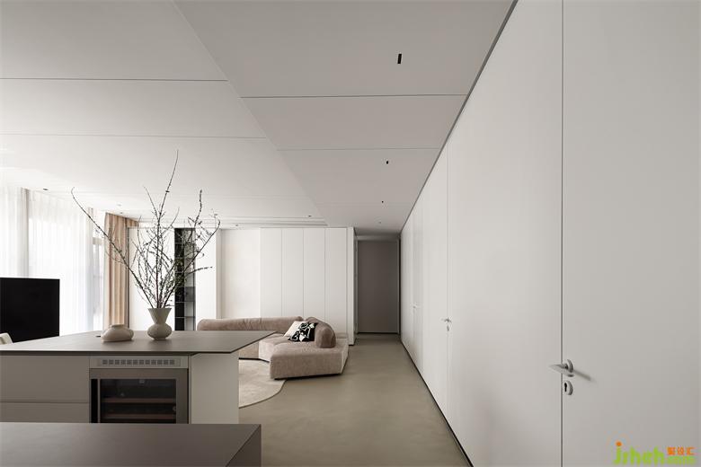 由無縫微水泥、無主燈,隱藏踢腳,暗藏門等流暢線性體塊打造連續(xù)、流動、整體化的空間視覺效果,天然材質(zhì)肌理和克制的色彩鋪墊出飽滿、舒緩的空間氛圍感。
