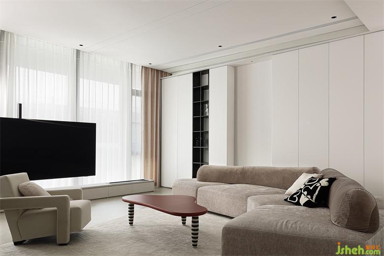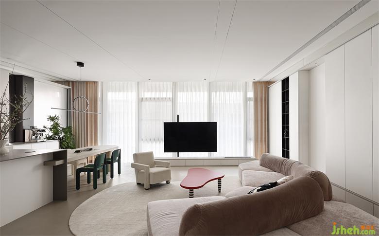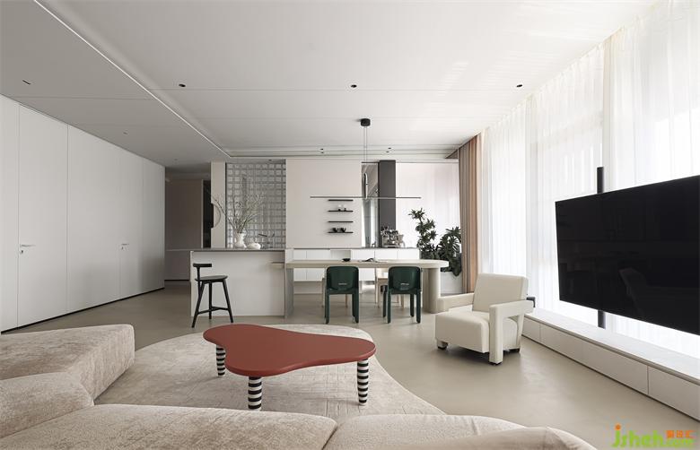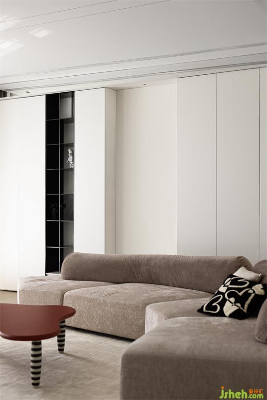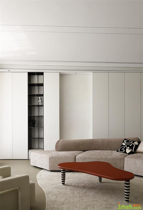 收納沿墻設置干凈利落,低矮家具圍合布局開闊大氣,再藉由材質(zhì)的變化銜接過渡功能區(qū),空間相互融合滲透,無論獨處還是陪伴都有最舒服的場域。