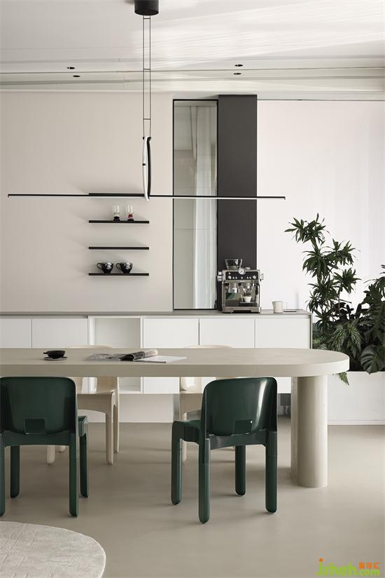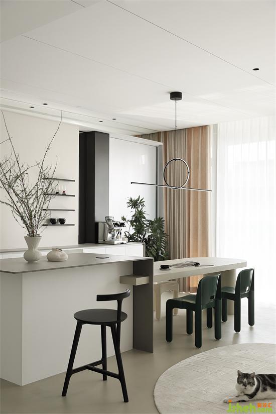 收納島臺搭配巖板臺面視覺上更輕盈,而微水泥餐桌則呈現(xiàn)另一種樸素厚重的裸感美,線條曲直與體量變化,材質(zhì)的對比和結(jié)構(gòu)的穿插,海府壹號家裝設計打造兼具開放性、社交性、多樣性等多種屬性的餐島臺空間,滿足居住者對原生態(tài)和慢生活的追求和向往。