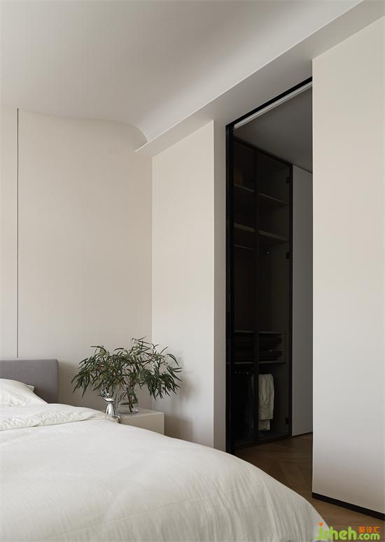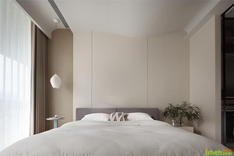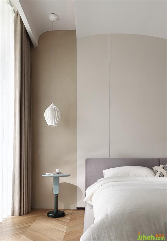 延續(xù)純粹與極簡,由微水泥與藝術(shù)涂料裝飾床頭背景,色感清甜,既有侘寂的自然素雅又有奶油般的溫柔精致。