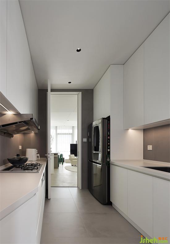 中西廚分離,海府壹號家裝設(shè)計為居住者的休閑生活提供了更多的便利,廚房雙一字型布局留出通往陽臺的過道,動線簡單功能清晰。