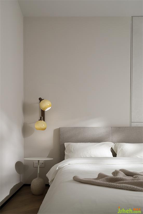 次臥做臨時(shí)客房使用頻率較低,規(guī)劃了兩米的開(kāi)間剛好擺下1.5m的雙人床和床頭邊幾,床尾保留收納,剩余開(kāi)間給到公共區(qū)域做日常用品的收納補(bǔ)充。