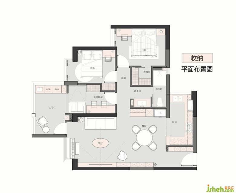 1.原格局過道偏空間右側壓縮了餐廳、衛(wèi)生間以及主臥空間,縮短沙發(fā)背景之后,使通往臥室的過道處在空間中軸線上,同時釋放有輕食臺的餐廳、三分離衛(wèi)生間、帶衣帽間的主臥、可三面下床有獨立書桌和收納的次臥,以及靈活的多功能房。