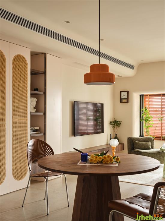 空間上結合小婉子對風格色彩的偏好,弧形結構搭配奶油色作溫柔耐看的硬裝基底,古著木色與清新調色色融于其中,瀚海東岸家裝設計平衡現(xiàn)代北歐與復古,打造自然樸實且輕松的中性空間氛圍。