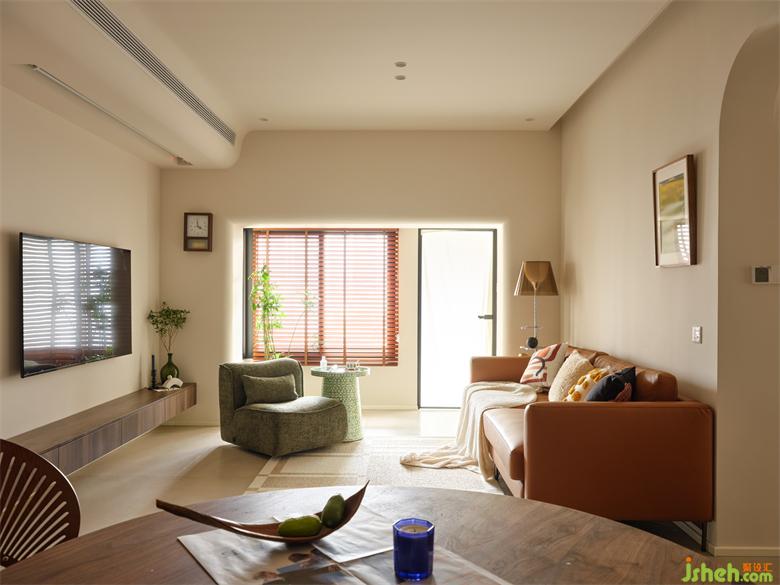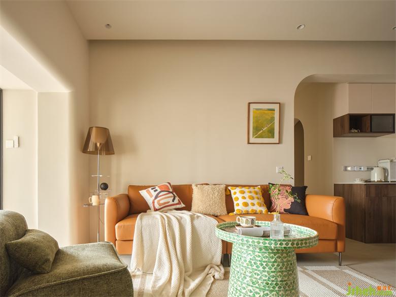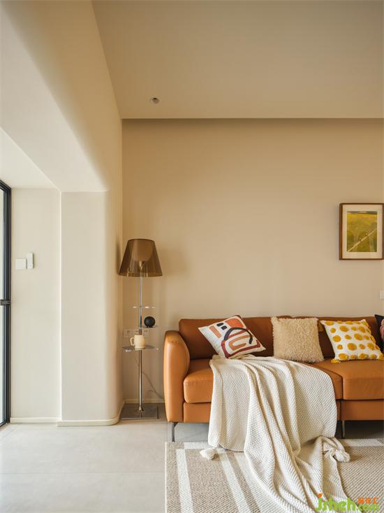 壓縮的沙發(fā)背景仍有三米寬,瀚海東岸家裝設計自帶復古色感的皮料沙發(fā)搭配書架落地燈為喜愛閱讀的屋主增添休閑閱讀角。