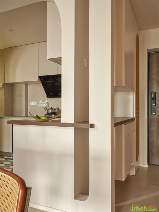 玄關柜與廚房做了結構穿插自然銜接過渡,瀚海東岸家裝設計滿足收納功能卻不見收納體量,同時鏤空的結構為遠離采光面的玄關增添自然光線。