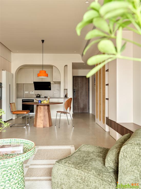 2.拓寬進門過道,釋放玄關空間,收納靠墻歸置,瀚海東岸家裝設計公共區(qū)由功能家具圍合靈活動線,廚房做開放式,打造開放通透的lDK一體化空間。
