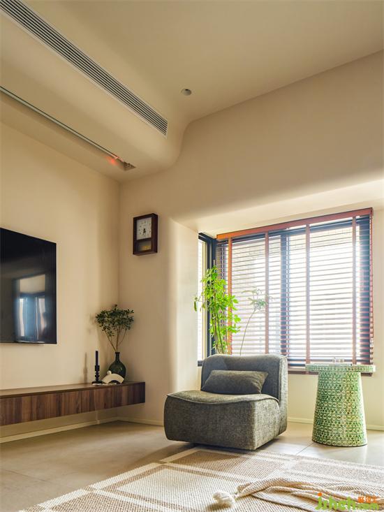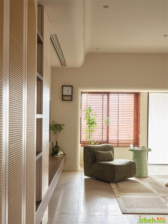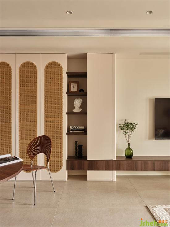 懸挑柜由電視墻延伸穿插至過道的通頂柜作休閑空間的收納補充,藤編柜門與開放層板架弱化收納體量,實用滿滿的同時空間兼具呼吸感。