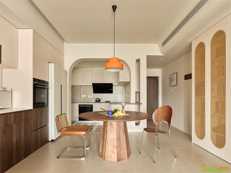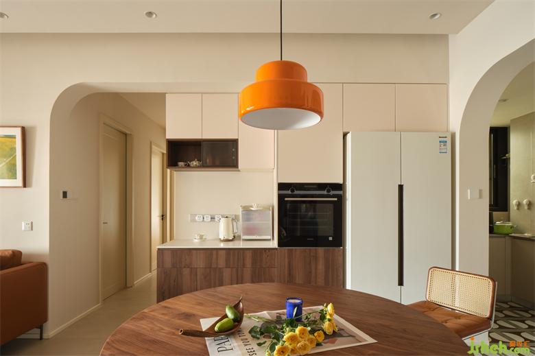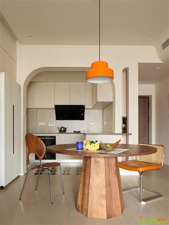體快感十足的復(fù)古餐桌輔以橘色吊燈點綴,瀚海東岸家裝設(shè)計圍合團(tuán)圓意向同時釋放洄游居家動線,沉穩(wěn)又清新的配色為中性空間注入暖意融融。
