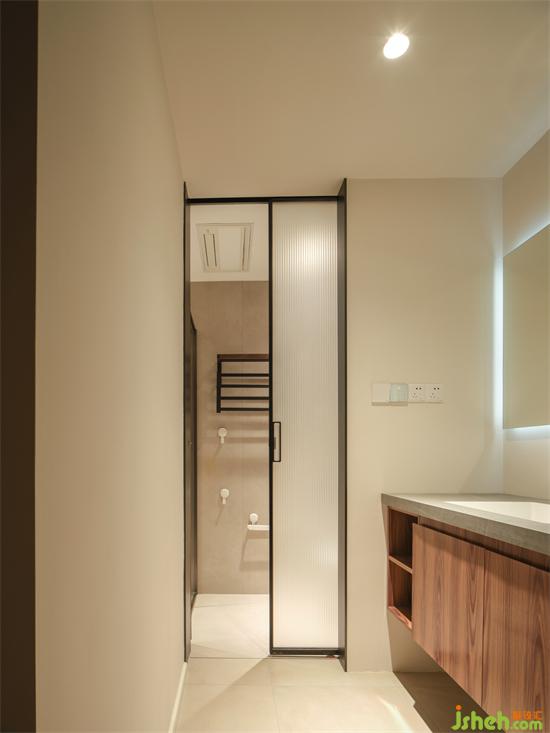 公衛(wèi)干濕分離提高使用效率,家裝設計在洗手臺另一側(cè)做薄墻嵌入收納壁龕,釋放清爽洗漱區(qū)。