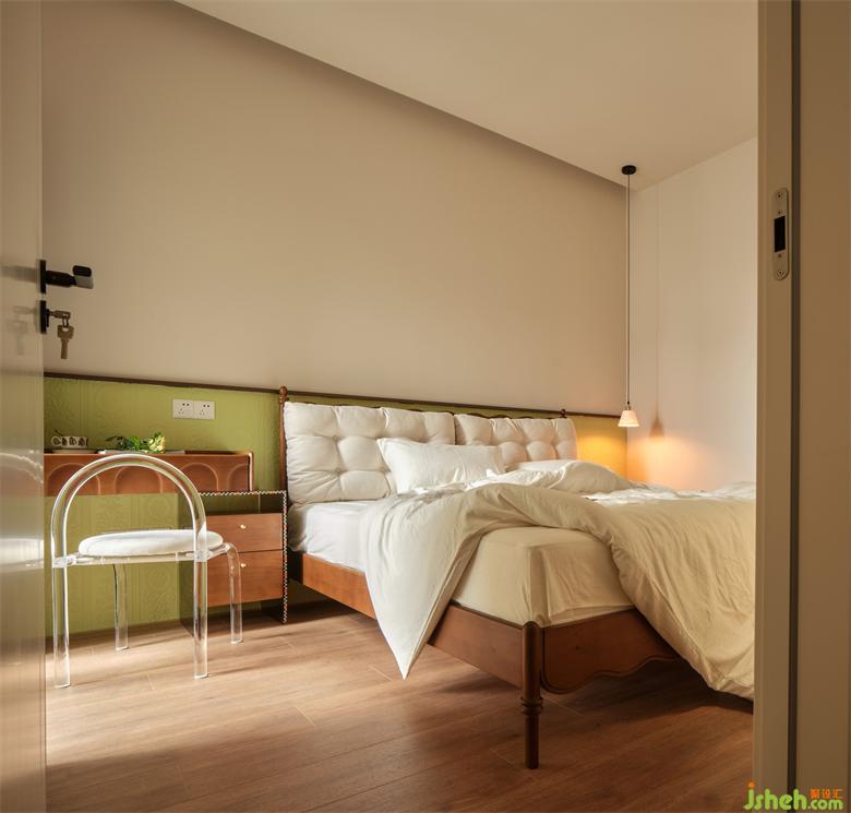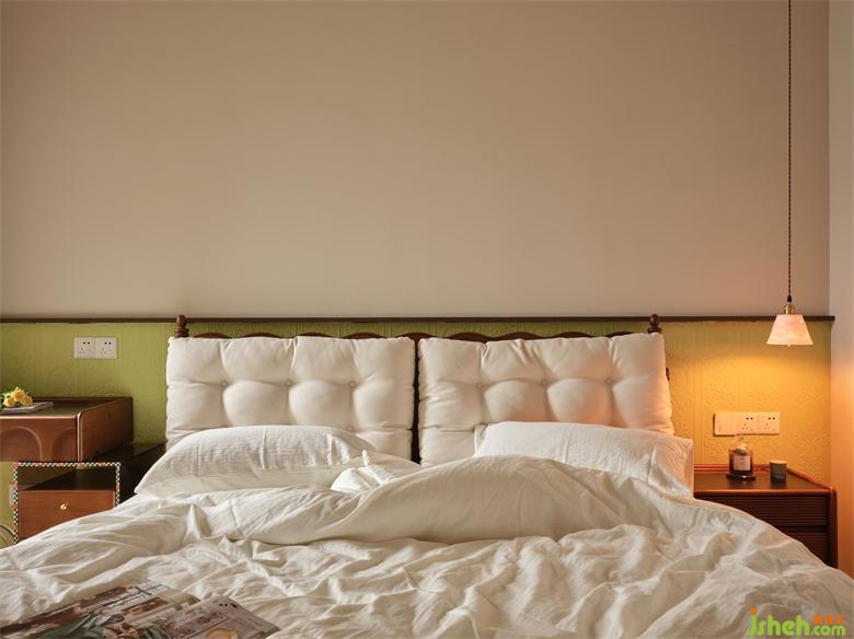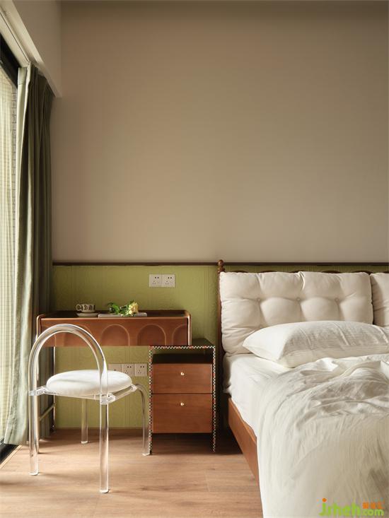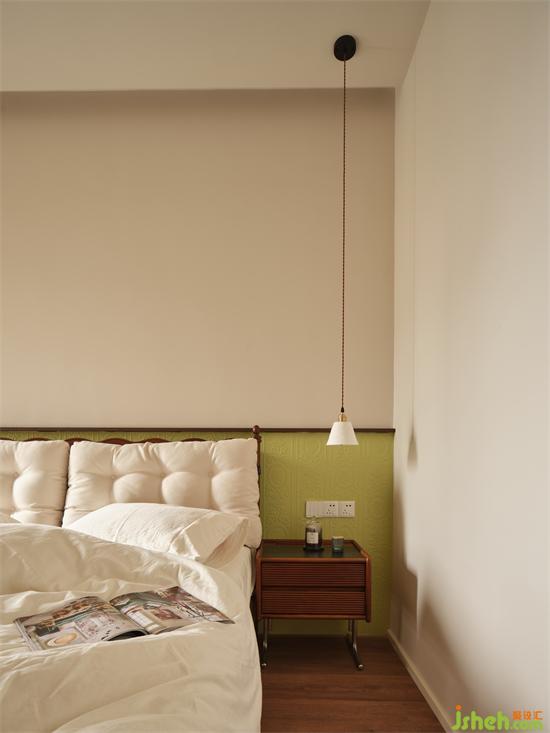 臥室床頭采用半高的淺綠色?;甲鞅尘把b飾,瀚海東岸家裝設計古典花紋與其浮雕質(zhì)感與為奶油輕復古空間注入時尚精致家居感,清新淡雅又別具一格。