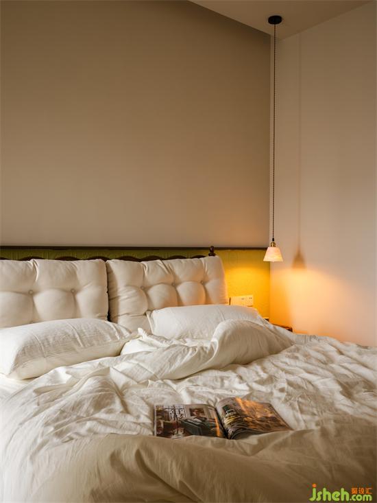 床頭陶瓷吊燈小巧精致,半透光的漸變厚度在暖黃燈源的映襯下產(chǎn)生群山疊影的層次變化,瀚海東岸家裝設計滿滿的意境和氛圍感。