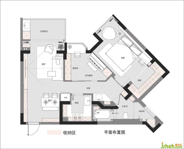 3. 廚房與浴室兩個(gè)狹長異型空間做了取舍,預(yù)留了滿足高效動線的u型廚房,異型凹位留至衛(wèi)生間,剛好可以擺上使用不高但能滿足幸福感的浴缸。