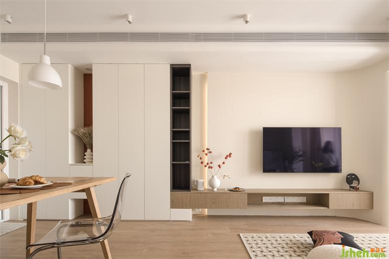 開間不大的公共區(qū)域,簡單干凈的立面搭配豐富有趣的低矮家居物件可以橫向拉開空間尺度,帶來通透開闊的視覺感受。
