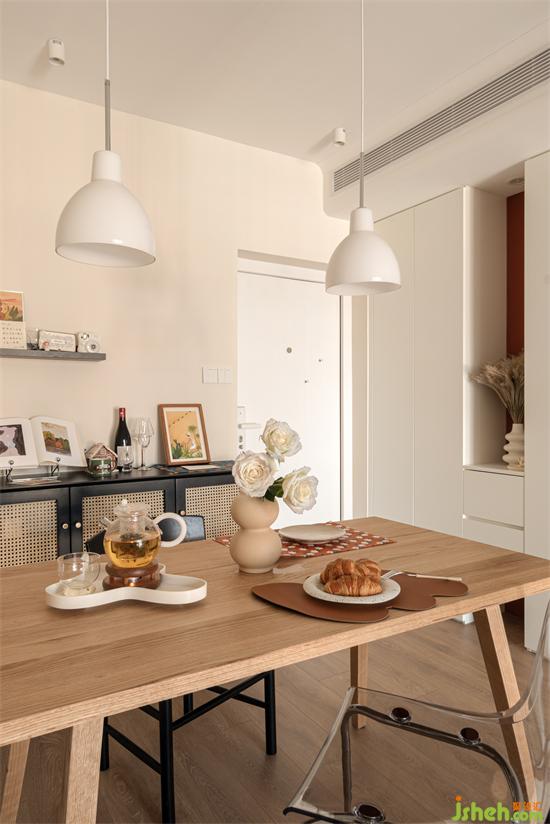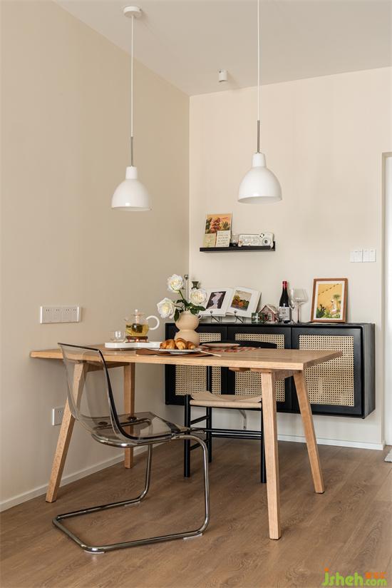 餐廳開間剛好適合1.4m的餐桌,三兩好友或者父母過來聚餐完全夠用,平時也兼做小兔的輕SOHO區(qū)。
