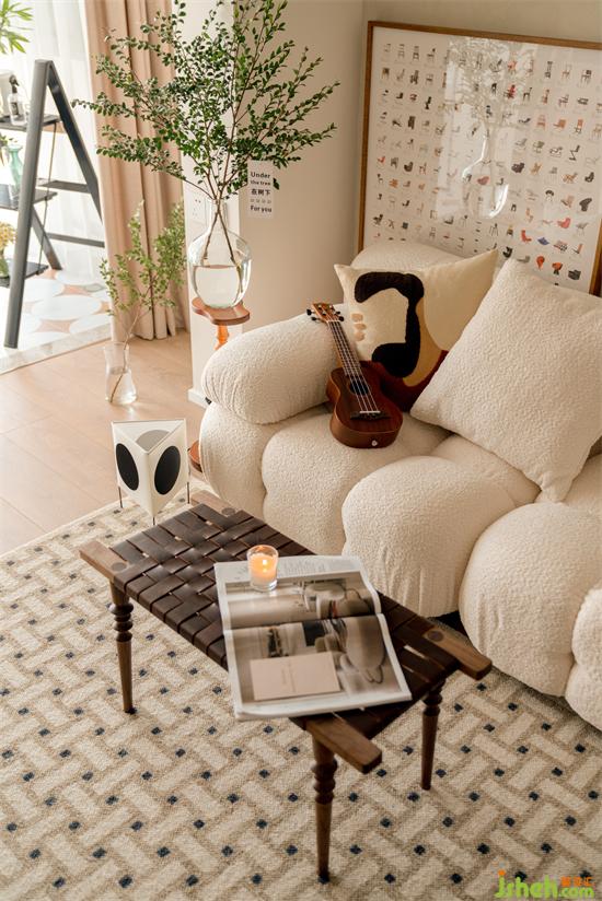中古藤編長凳作活動邊幾,置于客廳中心,一盞香薰燭臺一杯咖啡一本書即可開啟自我滋養(yǎng)的時光,也可作三兩好友圍坐暢談的小天地。邊幾挪至一邊時,開闊的地面空間可運動健身也可娛樂游戲。