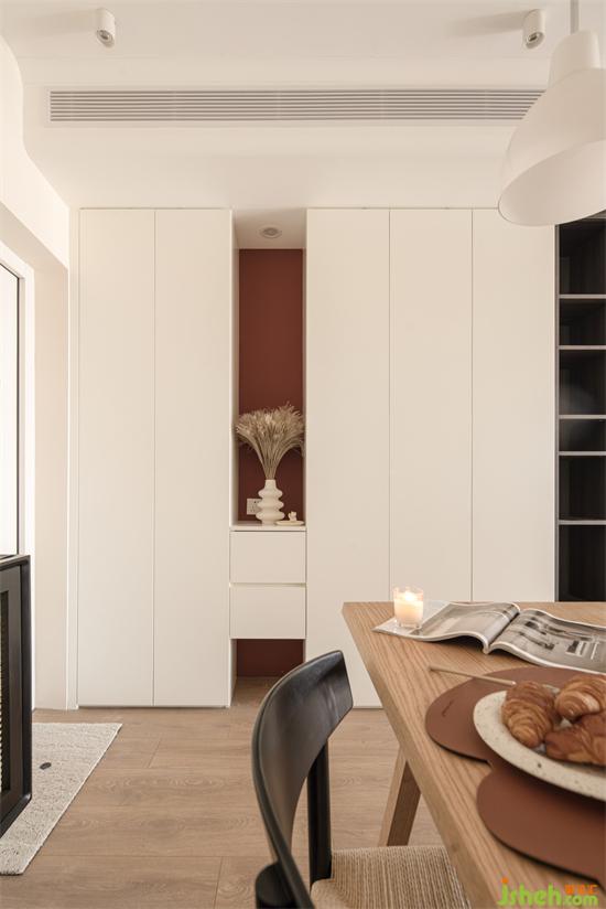 玄關(guān)端景的抽屜收納進出門隨手拿取的小物品,棕紅色做空間點綴色,積極且富有力量。