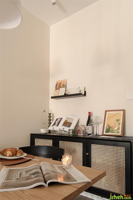 原木藤編與啞光黑搭配的餐邊柜復(fù)古雅致,放置各種紀念品和精致擺件在入門處形成一處獨特端景,也為歸家增添濃烈儀式感。