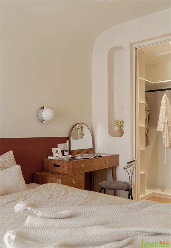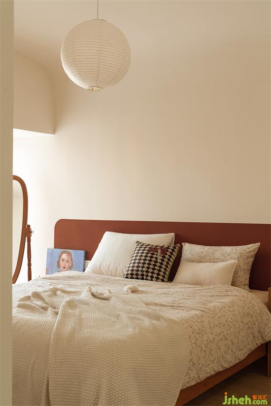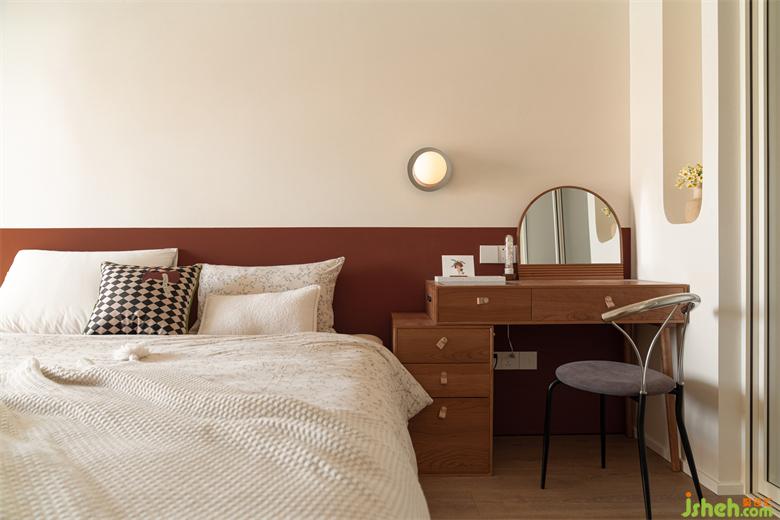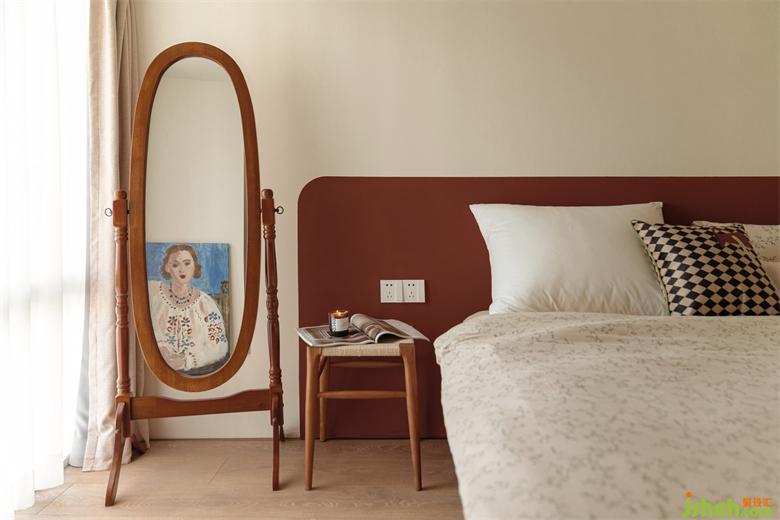 臥室空間沒有累贅的床頭背景,以半墻的紅棕分色作裝飾,家裝設(shè)計(jì)點(diǎn)綴復(fù)古奶油空間。