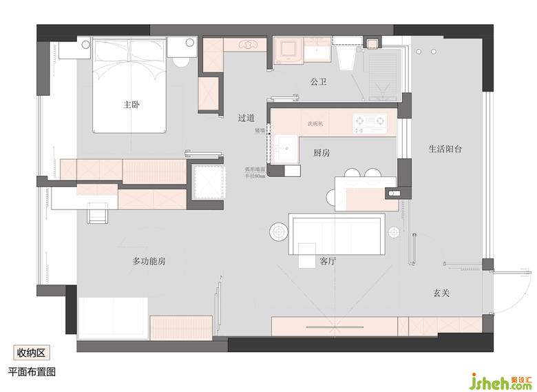 1. 考慮房子主要是MIA一個人居住,怡楓園家裝設計保留靠里的獨立臥室,取消與客廳相鄰的房間墻體,做開放多功能房,給公共空間增加自然采光,同時預留了折疊推拉門可以實現(xiàn)兼做獨立客臥的功能。