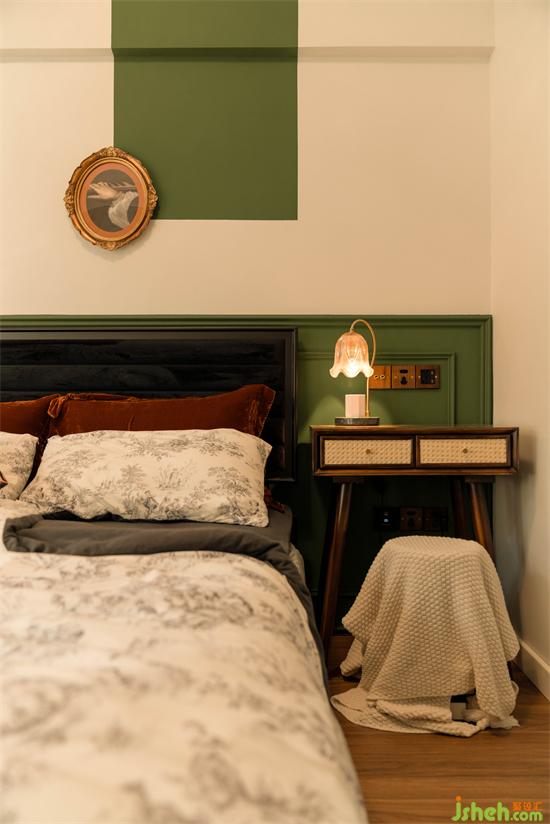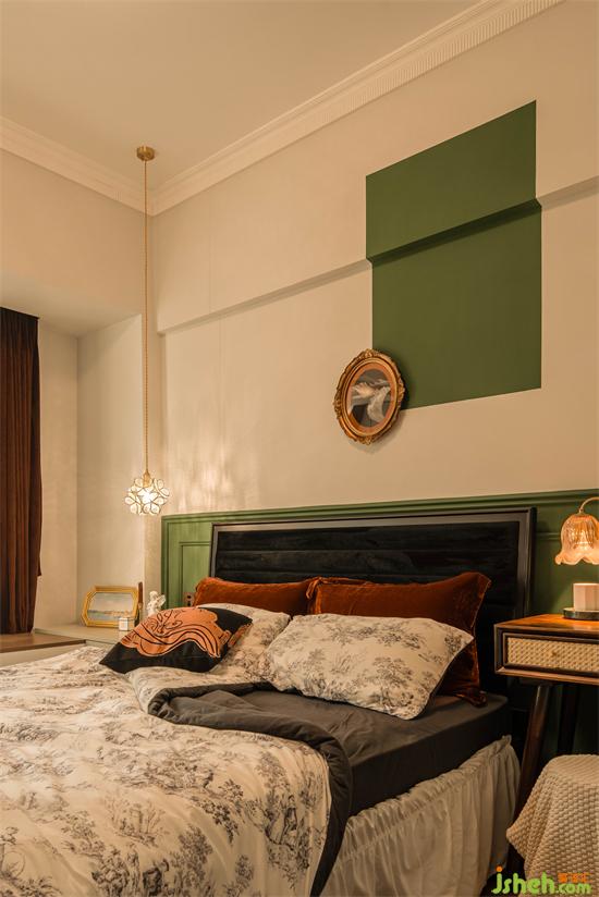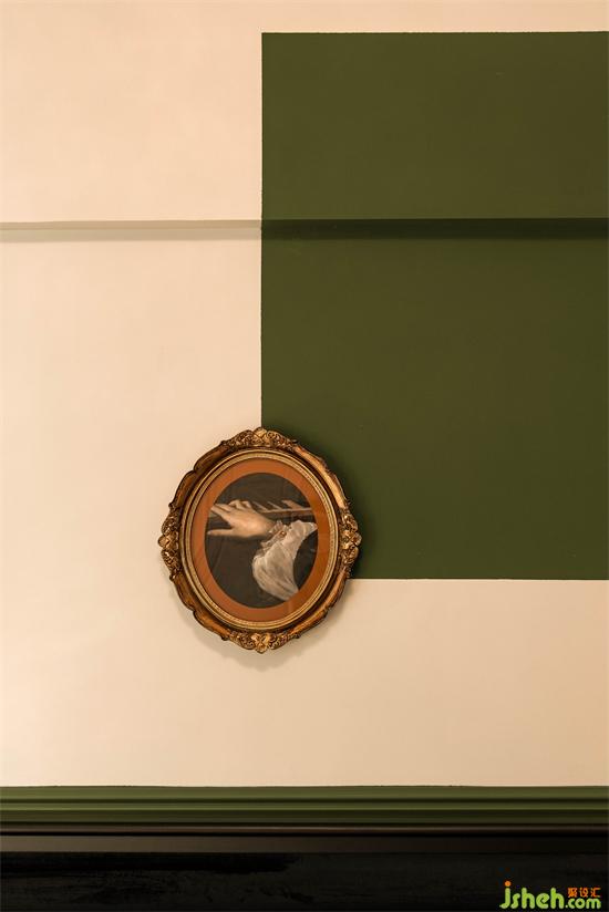 無意為之的墨綠與結(jié)構(gòu)粱位形成的折角增加了塊面的層次和立體感,乳膠漆與古典油畫的搭配,動靜虛實,方圓連接,讓造型背景充滿唯美律動的高級感。