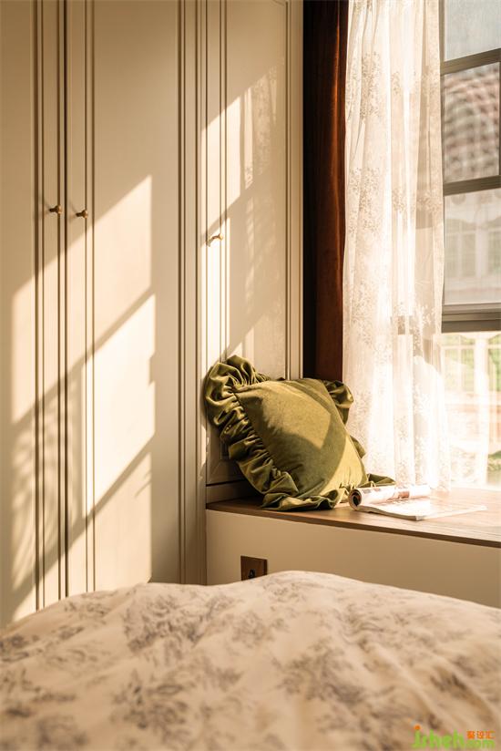 飄窗臺貼上溫潤木板,成就一處可倚可臥的休閑地。透過花紋窗幔打在柜子上的光影也很美妙。
