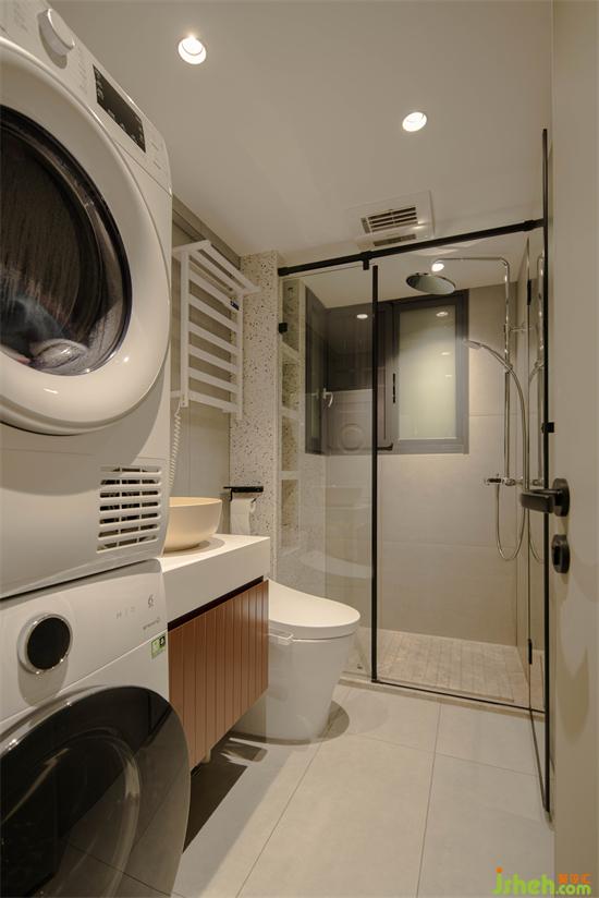 生活陽臺不能封,考慮方便還是把烘洗機挪進衛(wèi)生間,適當(dāng)?shù)膲嚎s了淋浴和浴室柜的位置,之于MIA一個人使用完全足夠的。一字型布局提供了高效的生活動線,所有洗浴功能皆可在這個空間完成。