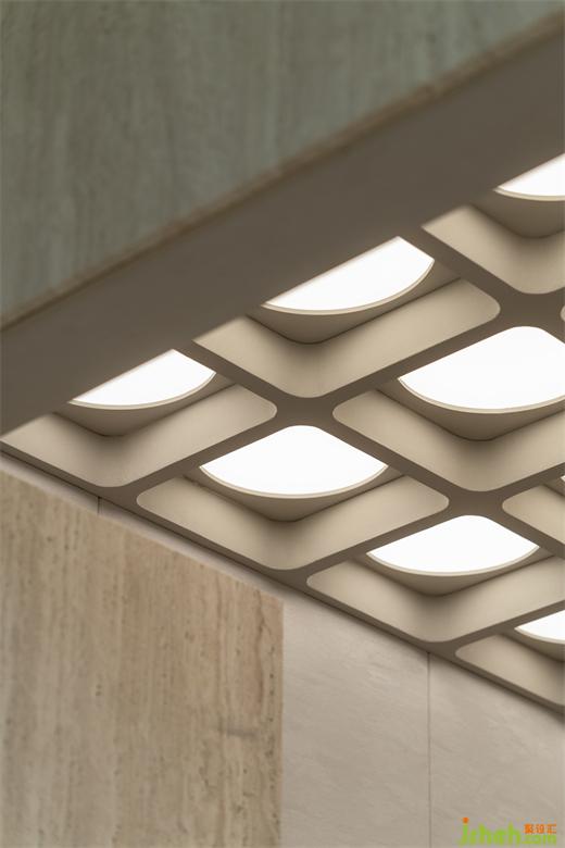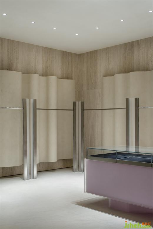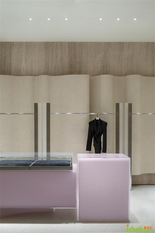 與試衣間一樣延續(xù)空間統(tǒng)一的設(shè)計(jì)手法,展廳設(shè)計(jì)通過材質(zhì)與光線的結(jié)合,為客人的試衣環(huán)節(jié)提供了舒適的場(chǎng)所,又能全面展示人與服裝的相襯。