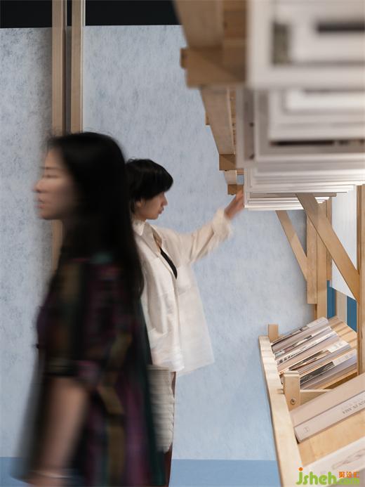 在空間動(dòng)線規(guī)劃中,我們通過(guò)不同板塊的內(nèi)容與呈現(xiàn)效果實(shí)現(xiàn)切分。其中不乏各類藝術(shù)家的展品陳列其中,人們可沉浸式查閱與游覽。當(dāng)進(jìn)一步深入內(nèi)里時(shí),便可在一處相對(duì)獨(dú)立的空間中,看見(jiàn)過(guò)往數(shù)期da雜志正通過(guò)傳統(tǒng)報(bào)架的陳列方式逐一展示,在慣常的閱讀體驗(yàn)之外,我們?cè)谝延械膱?bào)架結(jié)構(gòu)中加入了小型材料板裝置,上海展覽設(shè)計(jì)通過(guò)不同展板質(zhì)感的切面呈現(xiàn),賦予相對(duì)靜態(tài)的內(nèi)容更多層次體驗(yàn)。期刊分明、易于讀取。