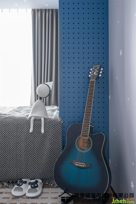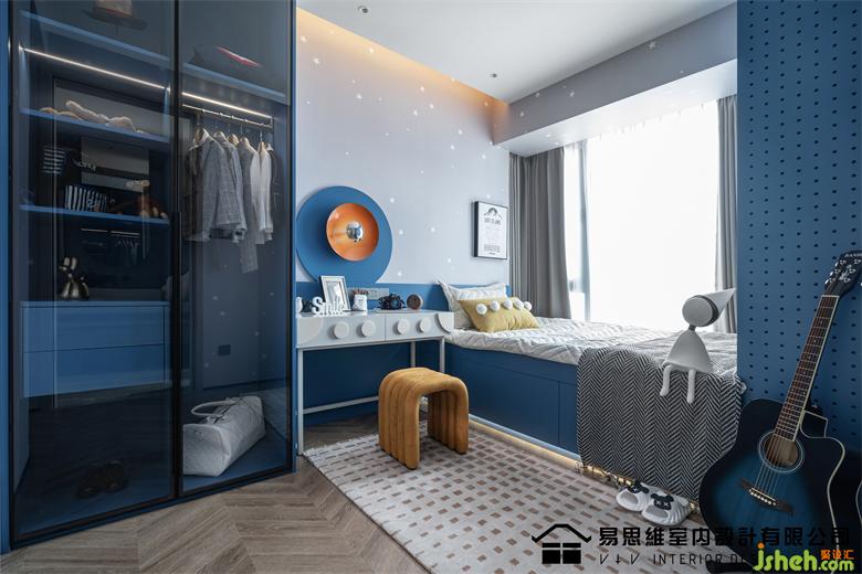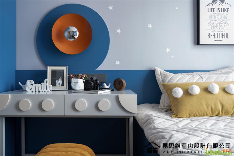 藍(lán)色作為空間的主流色,無形中賦予這個空間一種人格的屬性,這應(yīng)該是屬于愛做夢的少年,充滿童趣的空間催發(fā)著孩子的想象力。佛山家裝設(shè)計在大面積的藍(lán)色之中,融入淺色的灰藍(lán)調(diào)進(jìn)行色彩中和,形成對比且統(tǒng)一的視覺效果。亮眼的橙色仿照太陽的光芒賦予空間無限的創(chuàng)意以及對未來的期許。