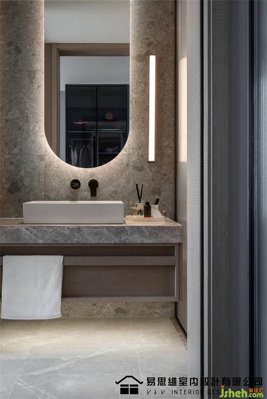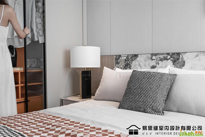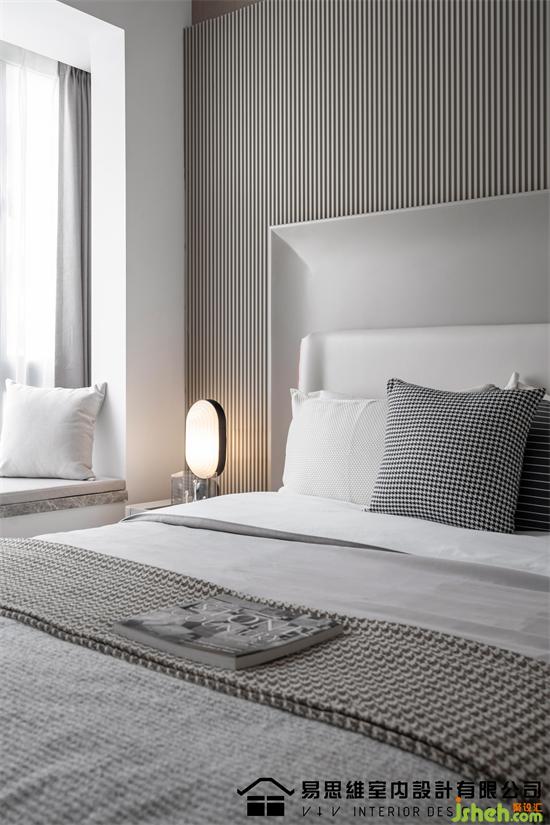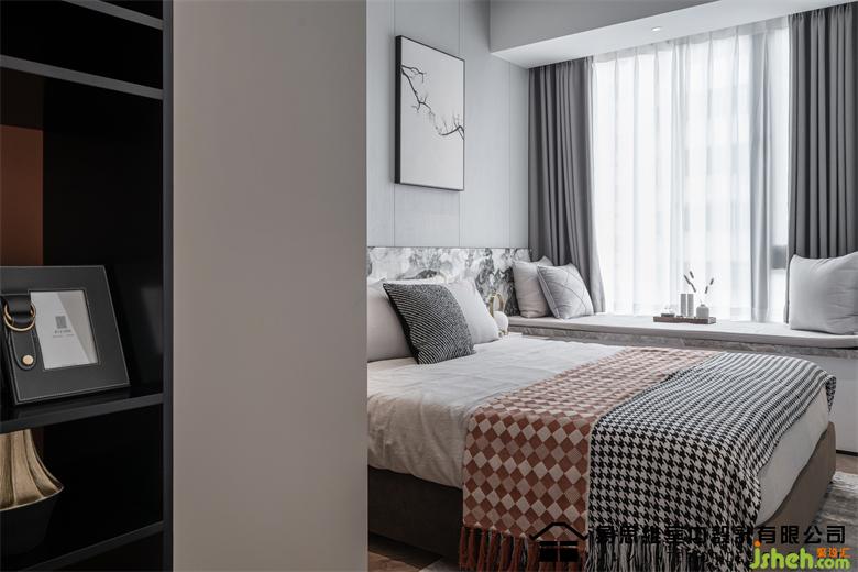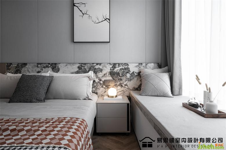 空間利用現(xiàn)下流行的墻面造型將視覺的注意力轉(zhuǎn)移在具有豐富圖案的石材紋理上,肌理表達(dá)出硬朗和干練的視覺,佛山家裝設(shè)計配合灰色調(diào)的床品、飄窗墊,傳達(dá)出穩(wěn)定安靜的情緒。