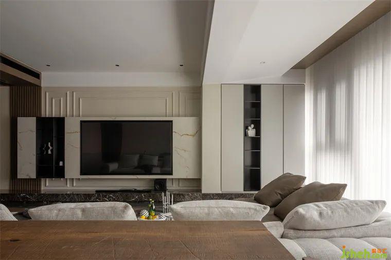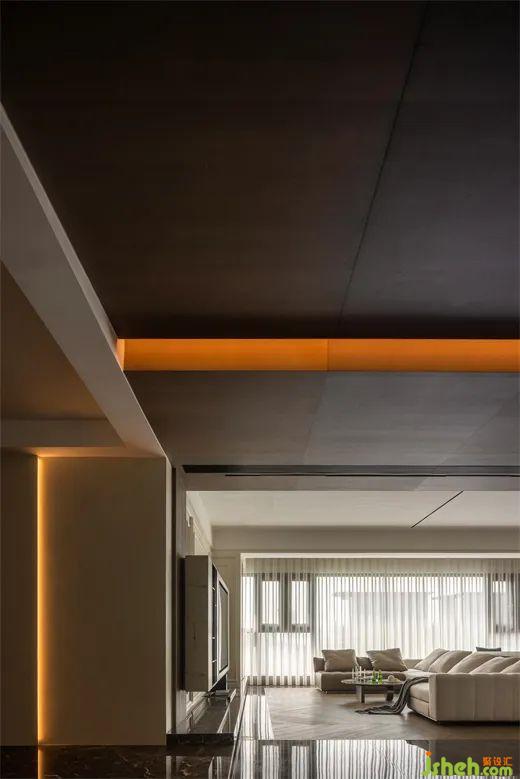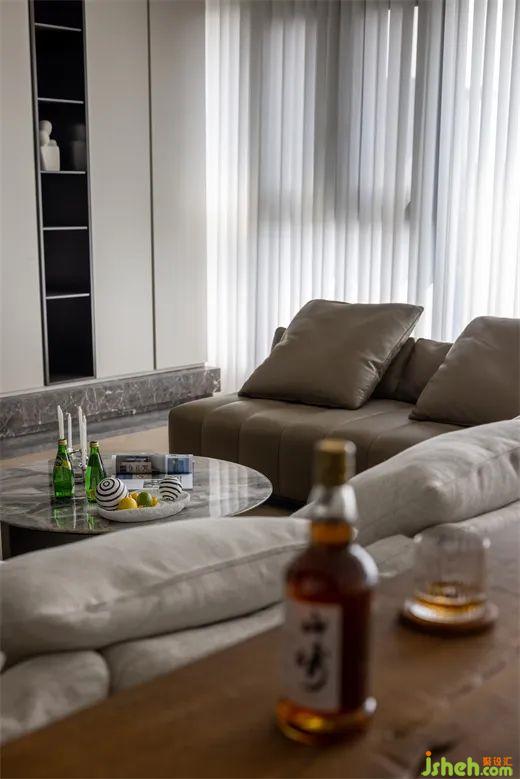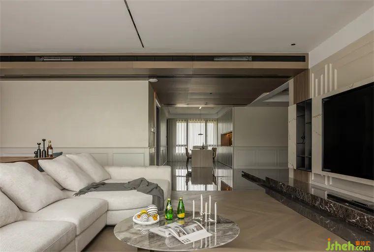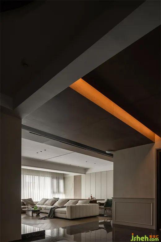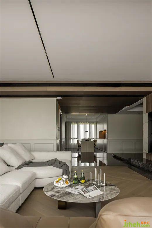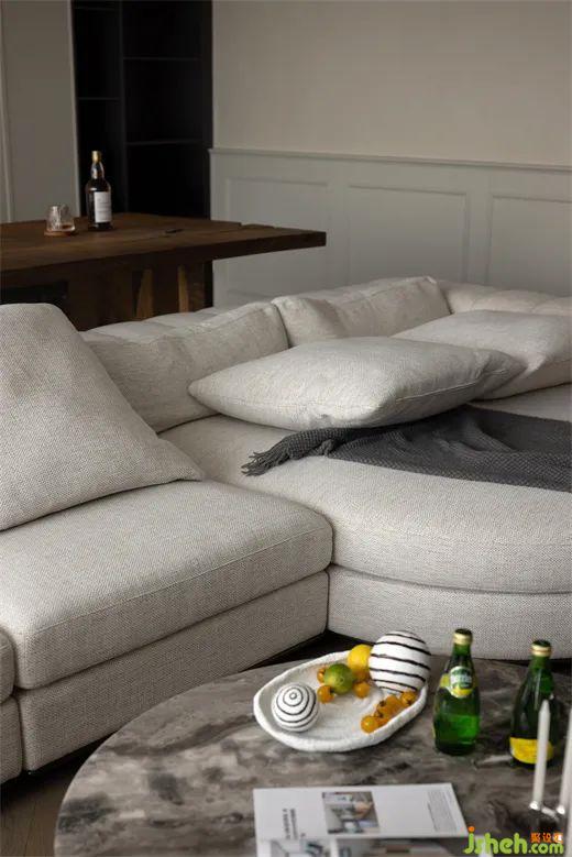 而客廳空間里的人字拼木地板和瓷磚硬碰收口的特色設(shè)計,又給客廳增添了一抹精致與獨特。