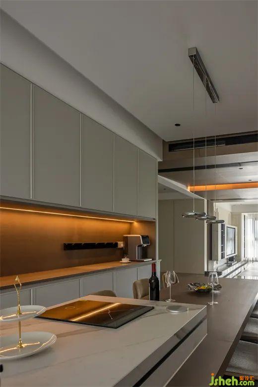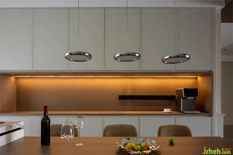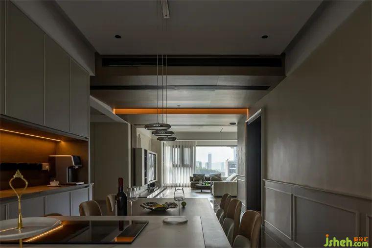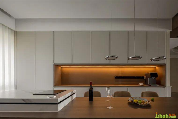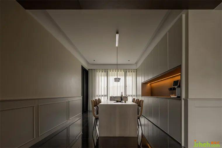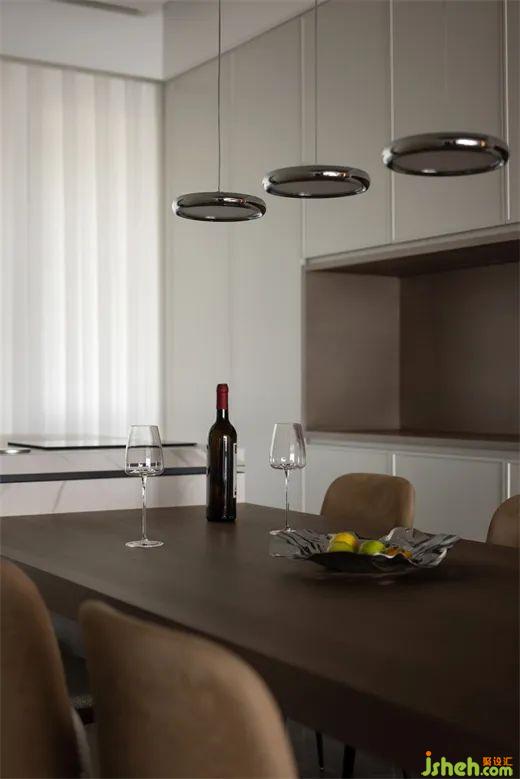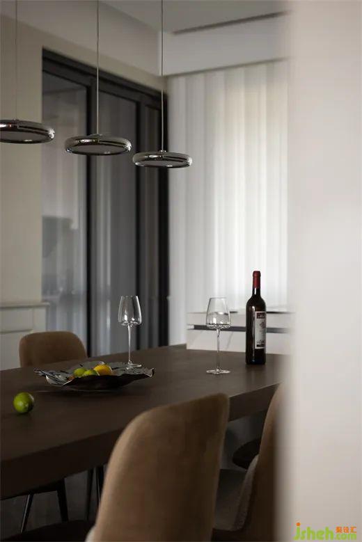 餐廳區(qū)域古樸柔和的木質(zhì)桌板與懸空的金屬吊燈相得益彰,在每個歸家的夜晚,家人圍坐此處品味人間煙火,共度溫馨時光。