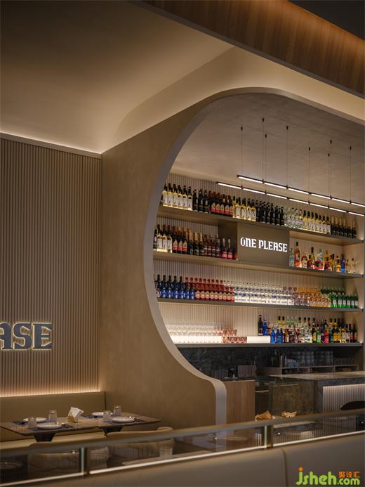 空間比例恰到好處的時尚吧區(qū)成為場域內(nèi)亮麗的風景,整齊的一字線燈將酒柜分割成秩序井然的上下空間,深圳俄式餐吧設計光束下的背景墻透露著紋理之美,簡潔醒目的金屬色One Please 增添了高級感。燈紅酒綠,虛位以待。