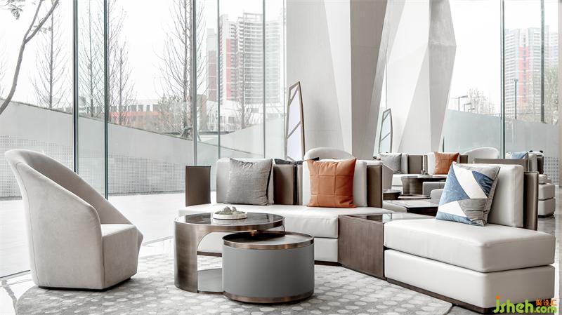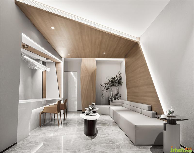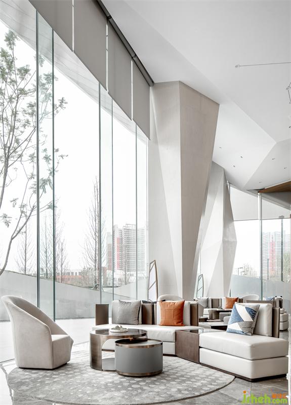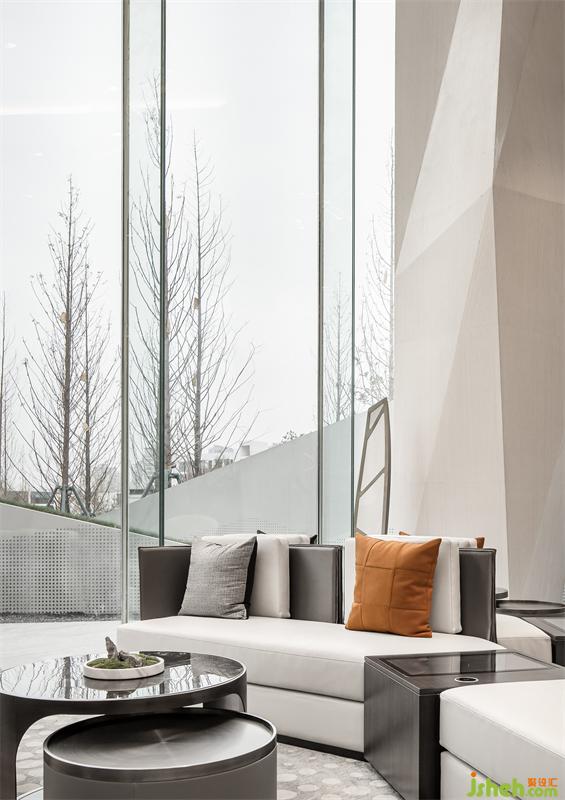 大輪廓建筑感手法的構(gòu)建,映襯下完成一次空間和心境恰到好處的過渡。在一層臨窗的洽談區(qū),材質(zhì)和色彩都豐富起來。被包裹的幾何構(gòu)成柱子如同升起的山體在空間中聳立、生長,敦實(shí)舒適的沙發(fā)和視覺中心處構(gòu)建出都市叢林中安全感十足的休息空間。