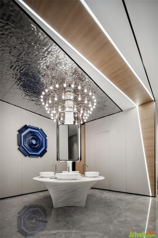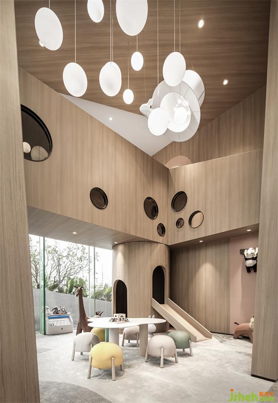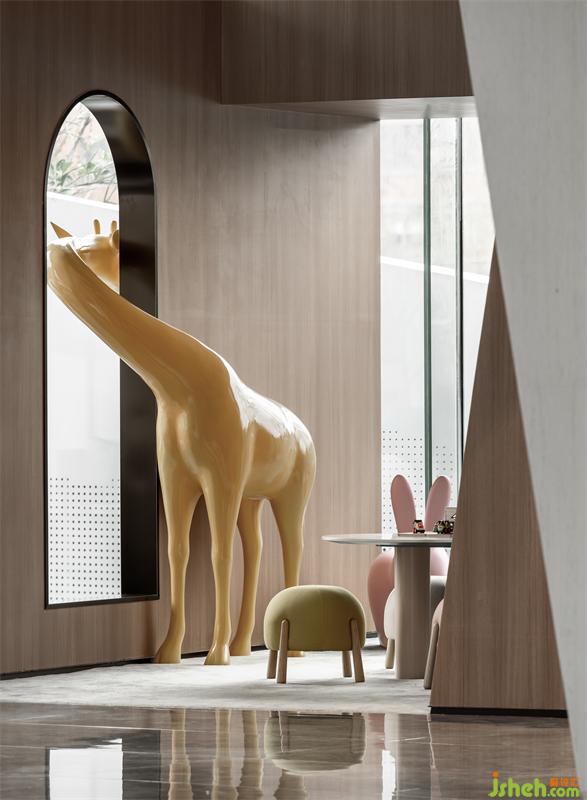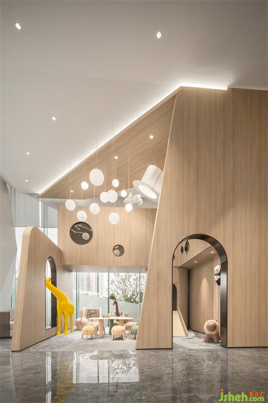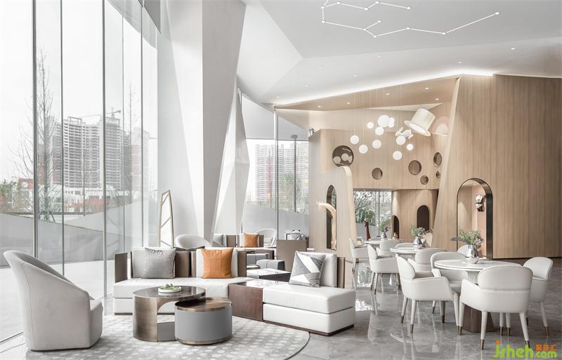 兒童區(qū)造了一所半開半閉的小房子,讓序列呈現(xiàn)的幾何體門洞充盈視覺畫面,積木游戲的場景思維試圖打破檔次與階層的障礙。故事基調(diào)是:售樓處設(shè)計(jì)找尋星河深處的那片愛麗絲夢游仙境,以魔幻為主題,懸掛在空中的魔法師禮帽突然有了魔法,兔子和夢幻氣泡鉆出營造奇幻世界,帶給人們感官驚喜。
