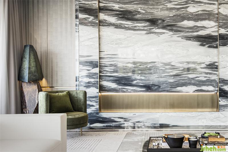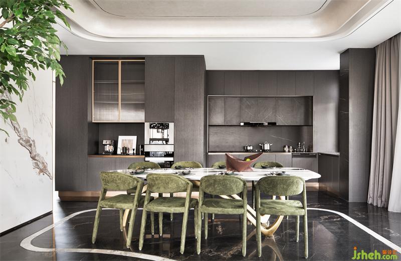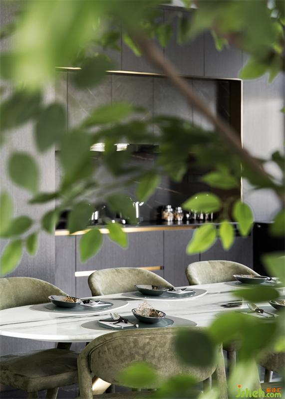 水墨溶于空間,客廳墻面的自由紋路向餐廳延伸,與大理石灰色桌面上的花紋呼應(yīng),樣板房設(shè)計(jì)在無序與有序之間,為素色清雅的空間帶來氣場,賦予了餐廳更沉穩(wěn)理性的基調(diào)。
