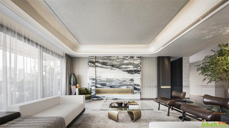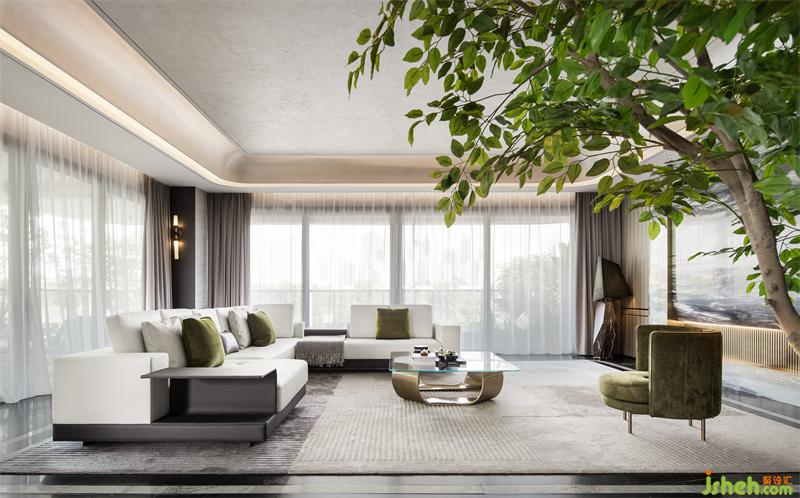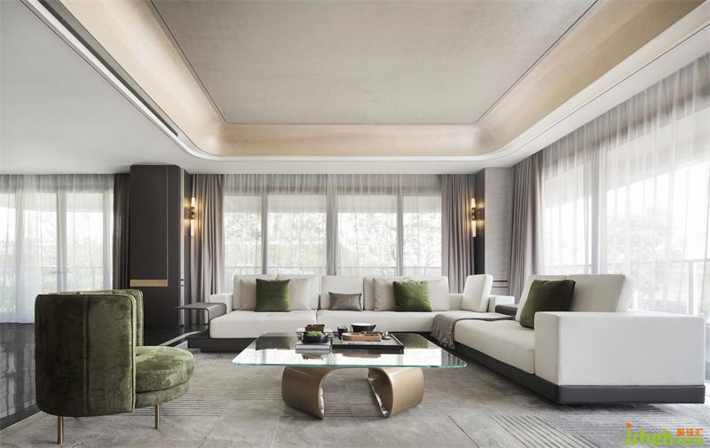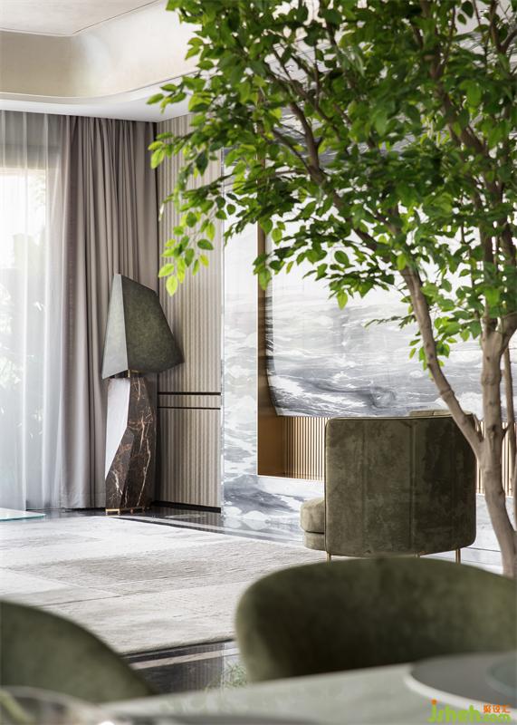 悠然步入客廳,色調(diào)的碰撞,線條的交錯(cuò),不同材質(zhì)之間組成了一幅令人眼前一亮的畫面。樣板房設(shè)計(jì)空間以白為主色,點(diǎn)綴些許橄欖綠。輕盈的窗簾、溫潤的木質(zhì)、雀躍的金屬、沉穩(wěn)的石材,在白色鋪陳的冷靜氛圍中,揮發(fā)出各自的物性。