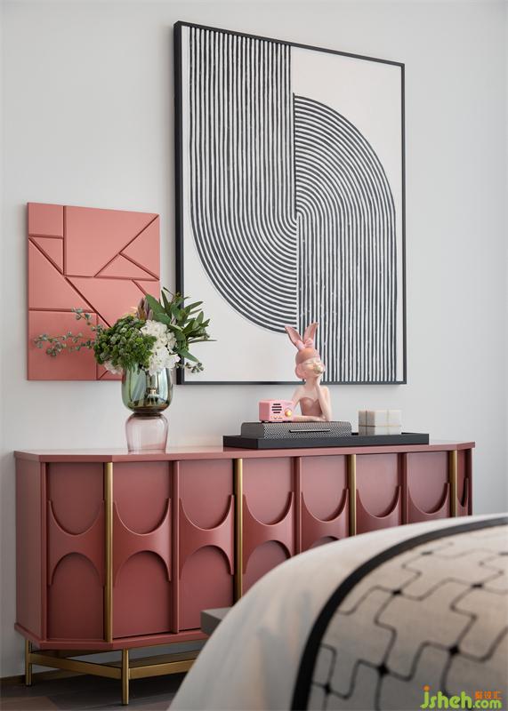 次臥以五彩色調(diào)為主,輔以金屬點(diǎn)綴,特別定制的奧爾蒂斯·米蘭諾元素的床屏與“酒具”元素的裝飾畫豐富了空間的細(xì)節(jié),樣板房設(shè)計(jì)實(shí)現(xiàn)了令人心安的品質(zhì)理想歸處。