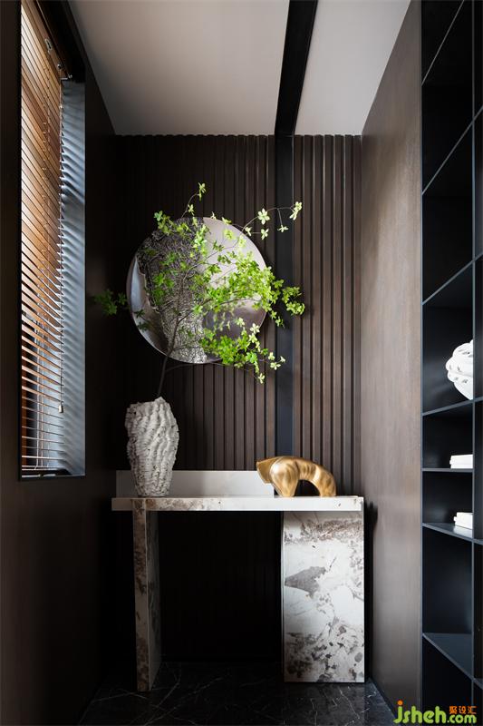 玄關(guān)處深色的木飾面與黃銅元素共同演繹復(fù)古風(fēng)華,雅中見致,靈中見韻,喚起當(dāng)代人的文化自信。