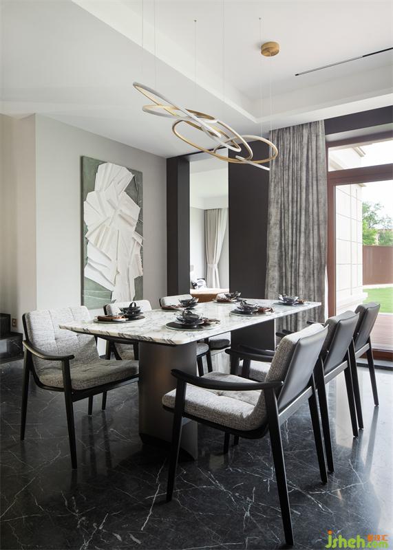 客廳作為連接餐廳與西廚吧臺(tái)的樞紐區(qū)域,無界體驗(yàn)感形成體驗(yàn)上的完整性。樣板間設(shè)計(jì)最大限度的利用自然光線,以相對(duì)克制的方式,讓室內(nèi)隨著室外光影陰晴變幻。