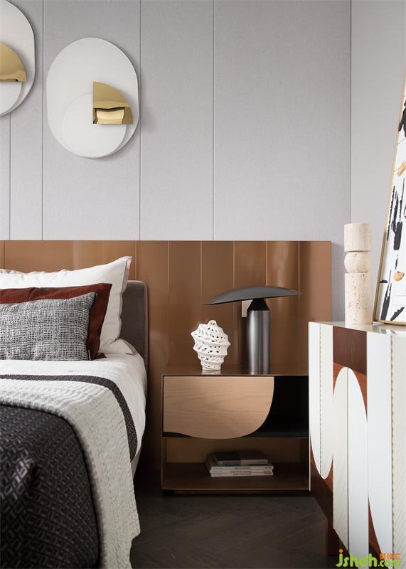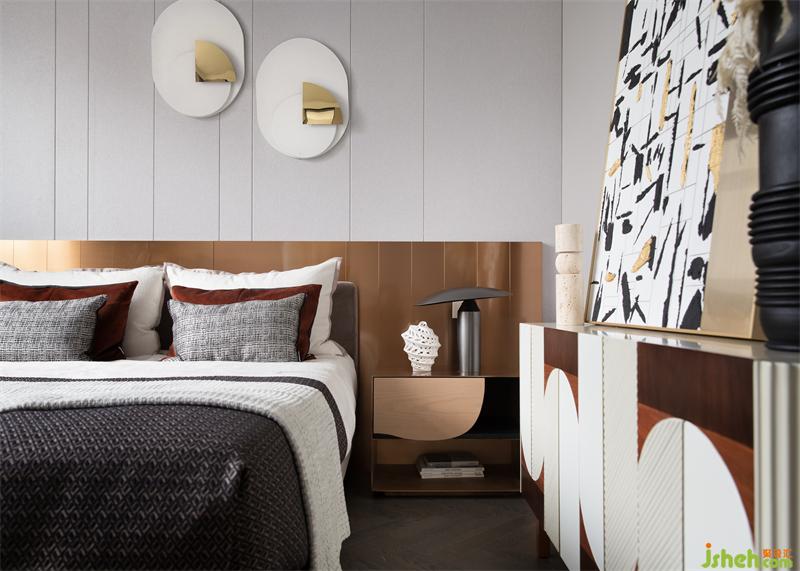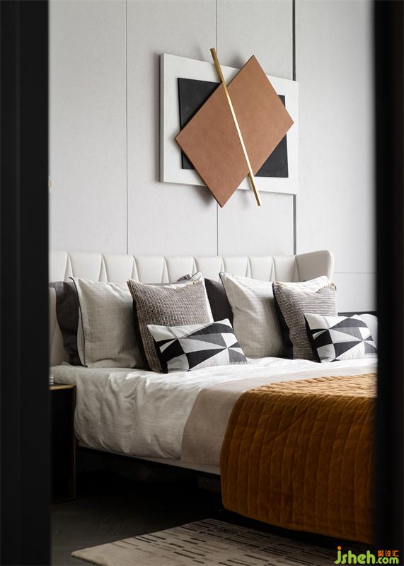 樣板間設計極具腔調(diào)的橙色床頭背景、舒適溫暖的布藝床品及幾何裝飾,碰撞出藝術(shù)的通感,形體碰撞,線條交錯,渲染出生活的多面可能。
